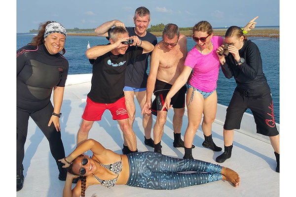 The Virgo is a relatively new member of the Emperor Diving fleet. It takes 18 divers but on our trip there are only 14 which makes for smaller groups with our three dive guides. Our fellow divers are a friendly, international bunch: as well as Brits, we have Russians, Bulgarians, Swiss and Irish so with our Maldivian and Taiwanese dive guides and crew we are a real United Nations. The routine is the liveaboard norm of "dive, eat, sleep". Wake up is between 5:30 - 7:00 and breakfast, lunch and dinner served in the spacious main lounge. We congregate around the bar on the upper rear deck in the evenings where barman Chandana mixes great cocktails.