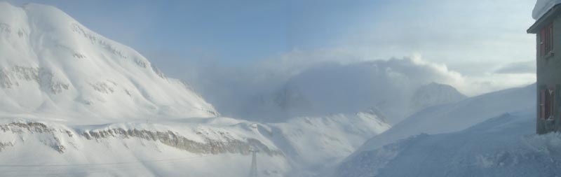 ![]() Day 2 weather is not encouraging - snow and wind. Nevertheless by 7 we are off. Terry decides to take the easier route (above) around the north side of the Ofenhorn. We ski down from the hut then put on skins for a 900m climb around a buttress then rising traverses to the col.